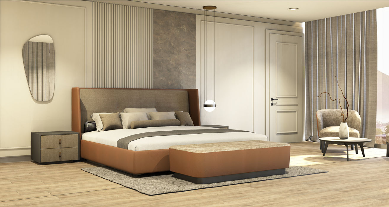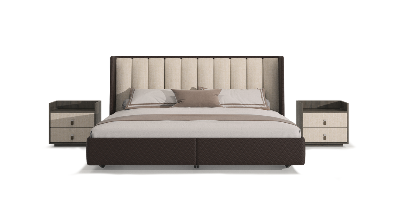 As the name Aurora refers to different things denoting beauty and hope, be it the beautiful northern lights or the Latin word for dawn, This bed was created to captivate the essence of natural luminous beauty and the feelings they inspire. The Aurora is a free-standing bed with two headboard types: one with elaborate vertical flutes and the other with simple button tufts both playing with contrasting materials and textures for more dynamicity.