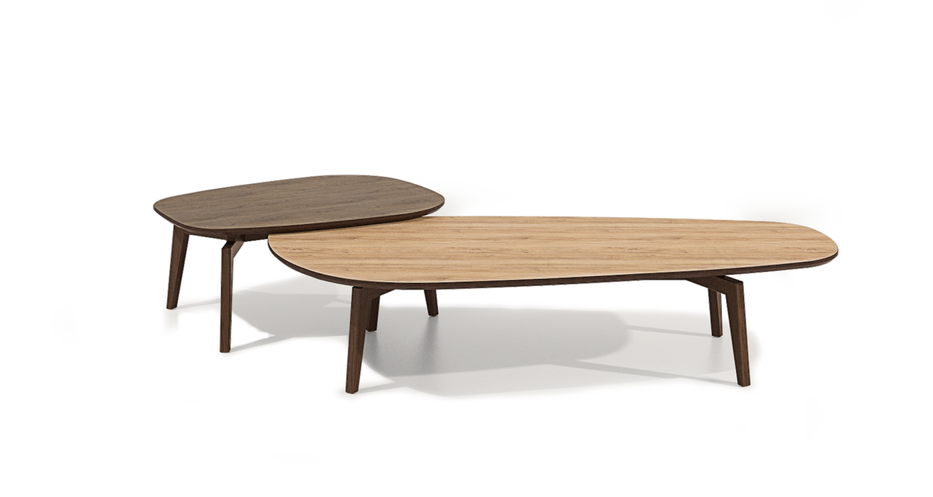 The collection has four tables varying in sizes, ‘Tumbled’ being the largest and ‘Gem’ being the smallest. Across all four tables there is a similarity; the tables are stabilised with four legs, each tapered and connected to a horizontal piece, which is then connected to the wooden spine that holds it all together.