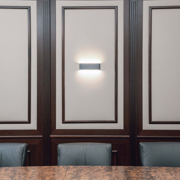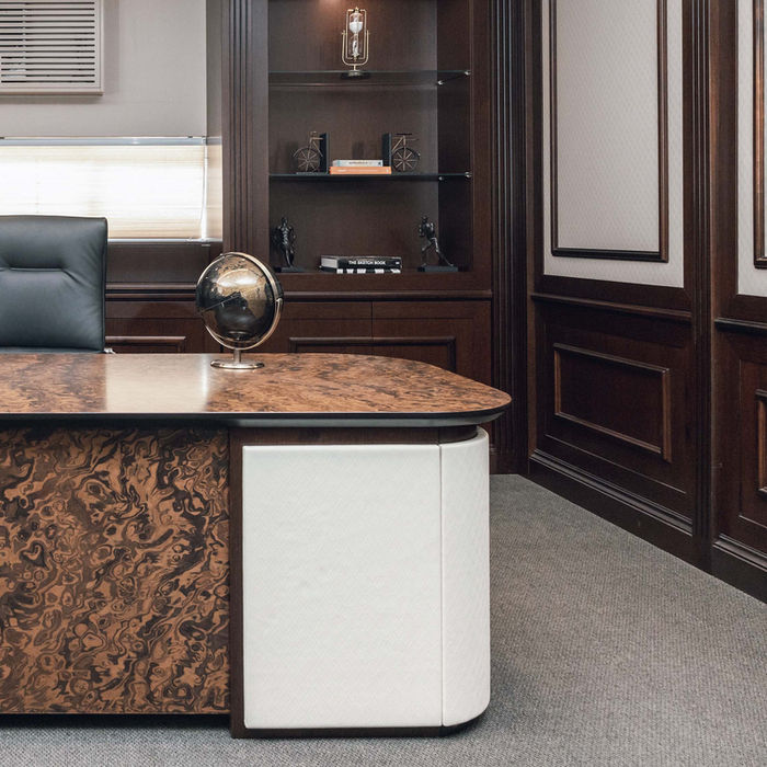 The wall panels are embellished with dark wooden moldings/profiles and leather-upholstered boards that also hold the simple rectangular wall lamps. Thus we created a hybrid Boiserie to emphasise the contemporary antiquity of our age. The contrast between the dark wood and light cream leather gives the space a more dynamic character, striking interest and conversation. The space is furnished with the Aso Desk finished with an eye-catching burl veneer and the same leather upholstered on the wall panel for continuity.