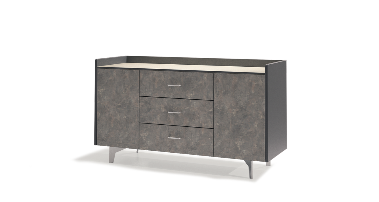 A fashionable sideboard equipped with two cabinets situated on the left and right with a set of three drawers in the middle, Chicago is individualised by its collar that creates a “U” shape from around the top of the sideboard simultaneously functioning as a barrier to stop items from falling. The whole unit is mounted on four die cast metal legs.